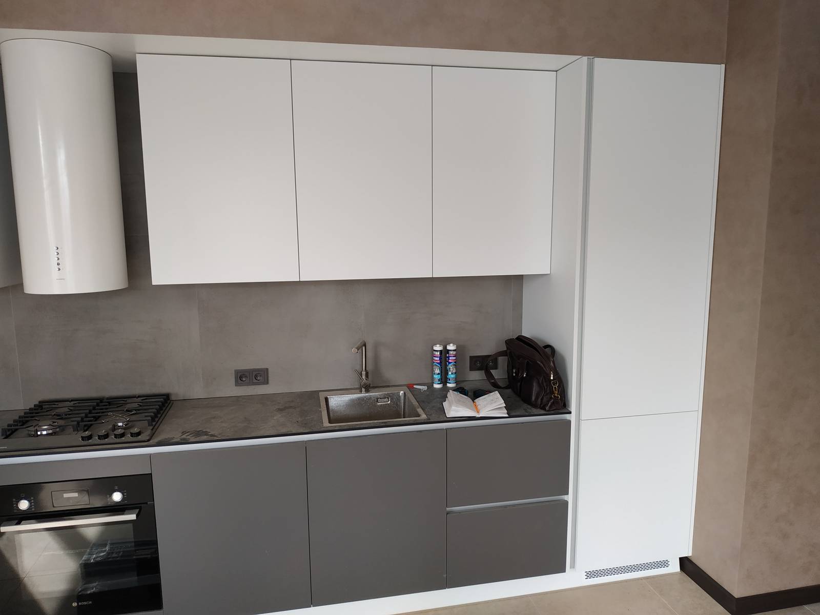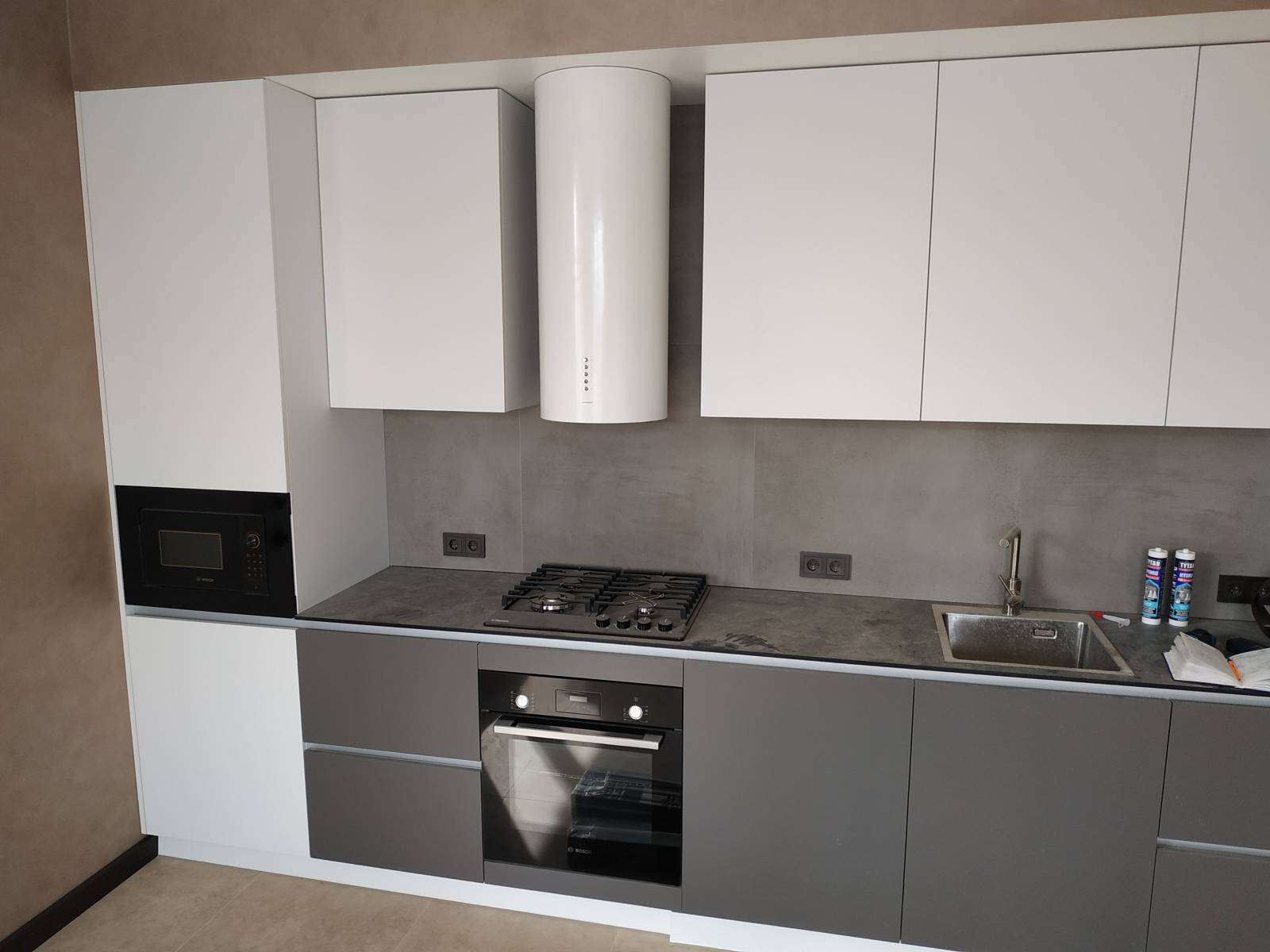 Прямая кухня «Графит» не поменяет внешний вид даже при активной эксплуатации, это достигается благодаря высокой прочности материалов, а также устойчивости к температурным и механическим воздействиям. Фасады без лицевой фурнитуры поддерживают актуальный тренд на избавление от визуального шума.