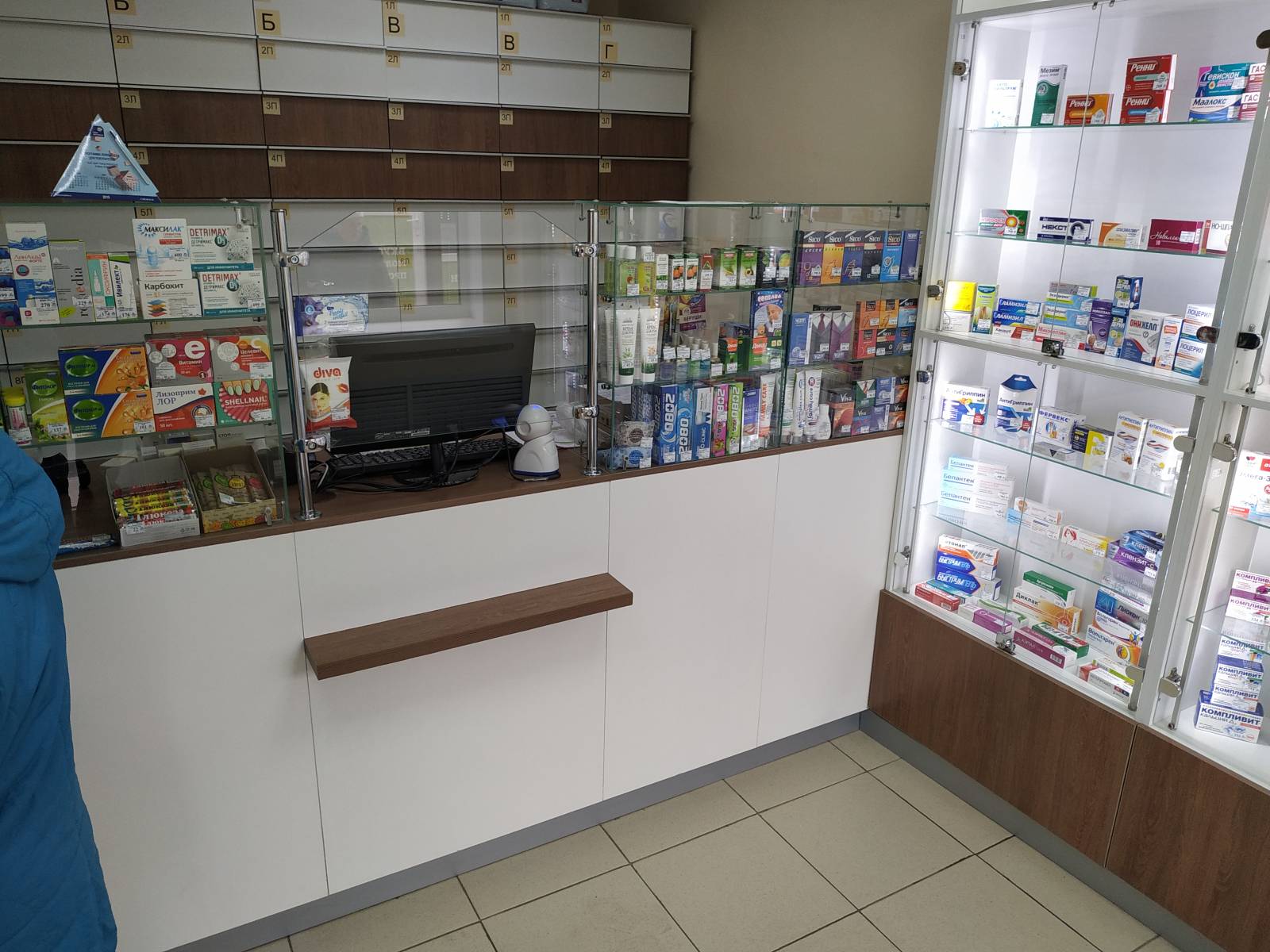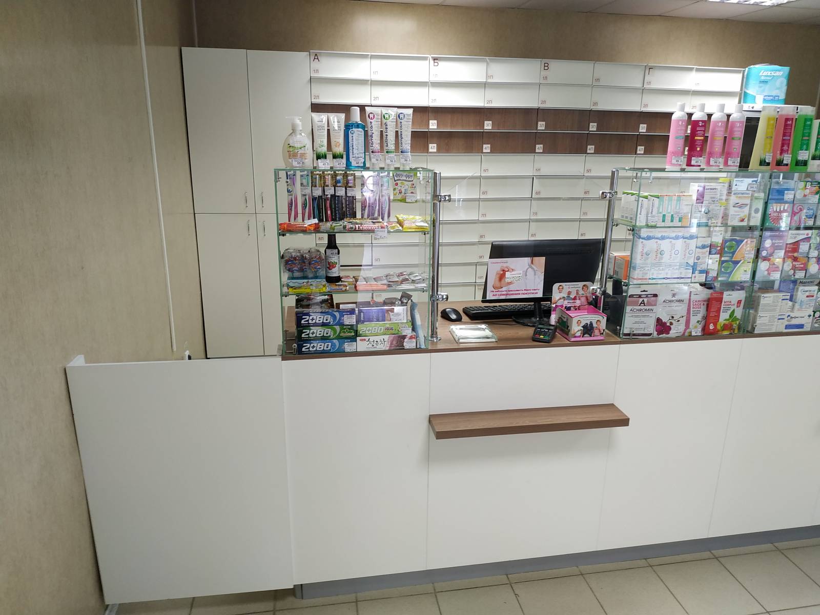- удобство – оптимальная высота позволяет видеть покупателя и комфортно с ним общаться, одновременно отгораживая место аптекаря от клиентской зоны;