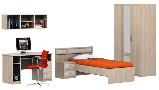 Спальный гарнитур имеет все необходимые предметы мебели, чтобы создать максимальный уют и комфорт в спальне для подростка. Возможно изготовление мебели с учетом индивидуальных параметров помещения. Гарнитур состоит из удобной кровати с высокой спинкой и совмещенной прикроватной тумбой, компьютерного стола с большой навесной полкой, которая подойдет для хранения литературы, а также с достаточно вместительным шкафом, декорированным зеркалом.
